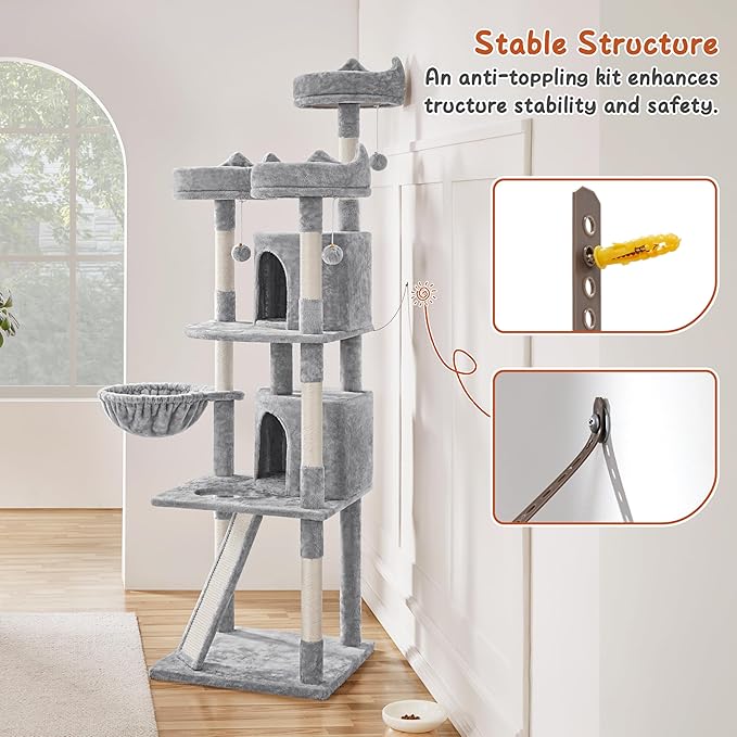 - Double Stability: Place the cat tree on a flat surface and position it in a corner or against a wall to enhance stability. For added protection, it includes an anti-toppling kit, allowing secure wall-mounting