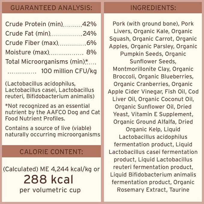 - Premium freeze dried raw dog food made with crate-free pork, raised without antibiotics, steroids or added hormones and with USDA certified organic fruits and vegetables. Grain free