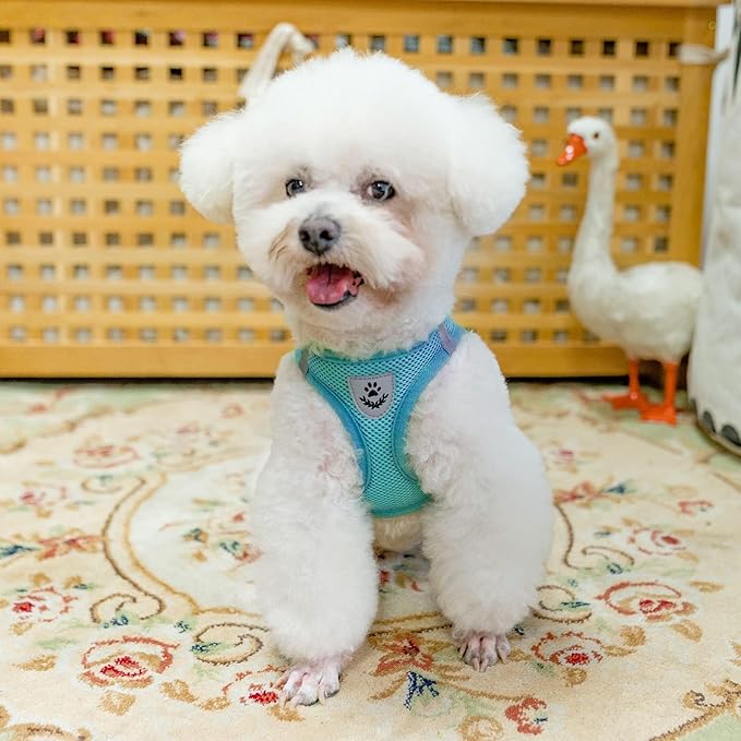 - [COMFORTABLE MATERIAL, DAILY WALKING, FOUR SEASONS WEARING] - The harness is made of durable polyester, and it's adopted with an air-mesh design. The whole harness is very soft, lightweight, and breathable. Even if your dog wears it all day, he won't feel any discomfort. For daily walking or running, it is a very easy thing to do. Besides, this is a four seasons harness, it keeps the dog cool on hot days and keeps the dog warm on cold days.