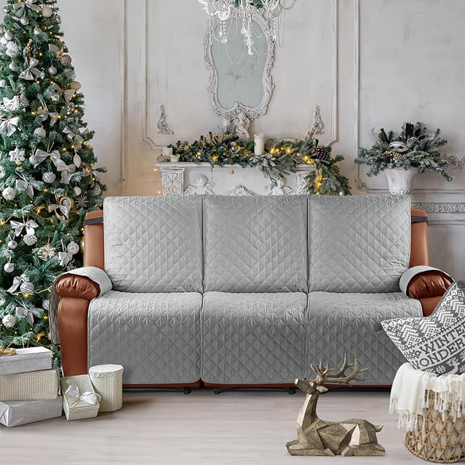 Ruaozz Waterproof Recliner Sofa Cover 1-Piece Couch Covers for Reclining Couches Reclining Sofa Cover Washable Furniture Protector with Elastic Straps Pocket for Kids, Pets (Light Grey, 3 Seater)