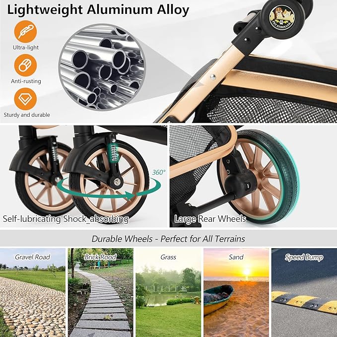 - 🐶😺【Luxury & Durability】: Crafted with a lightweight yet sturdy Aluminum Alloy frame. Kenyone C510L dog stroller offers unparalleled stability. The frame and 10.5" large rubber back rear showcase a stylish gold finish for a touch of elegance. The stroller is equipped with a washable, removable 600D Oxford cloth liner for your pet's comfort and easy maintenance.