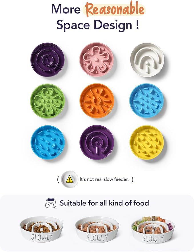 - Slow Down Eating, Bring Dog A Healthy Diet:Fast-eating dogs experience bloat, regurgitation, and obesity easily. Our slow feeder dog bowl design with the ridges and maze pattern helps your dog to eat slower than 13 times. Your dog could change his overeating behavior through a challenge and fun mealtime
