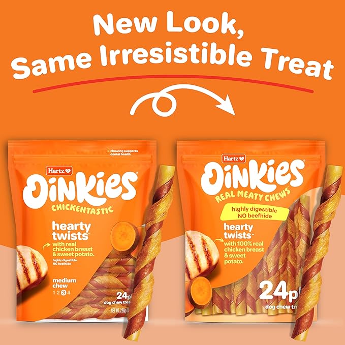 Hartz Oinkies Hearty Twists with Real Chicken & Sweet Potato Rawhide-Free Dog Treats, Highly Digestible Dog Chews, 24 Count