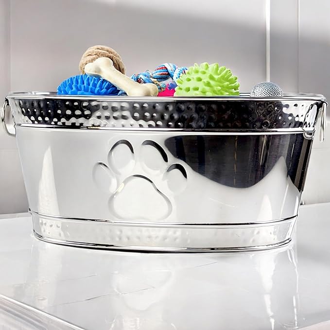 - LONG LASTING: The last dog toy storage bin you'll ever need. Built with a hammered stainless-steel design, this dog basket for toys is aesthetically pleasing in any part of your home.