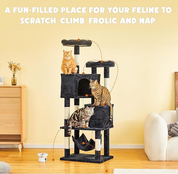 Cat Tree for Indoor Cats - 63in Multi-Level Large Cat Tower with 2 Big Cat Condos, 2 Padded Perches, Hammock, 6 Sisal-Covered Scratching Post and Toys for Kittens Pet Play House, Smoky Grey