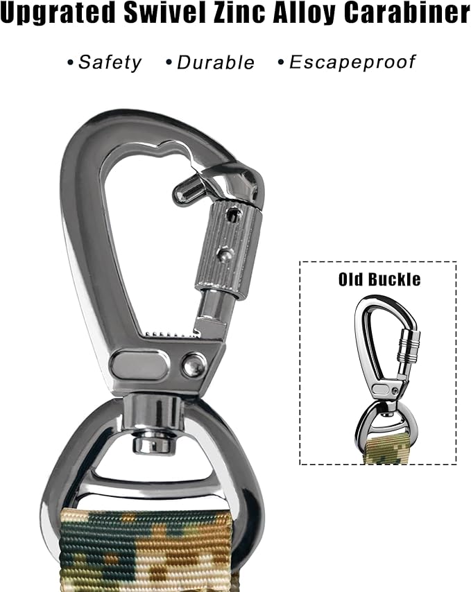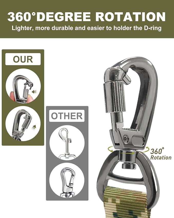 - 360°Rotating Locking Clasp: The heavy duty dog leash is fitted with a lightweight and super durable climbing carabiner which is made of aviation aluminum alloy with a Max Force Tension of 373 KG, the same material used and trusted by climbers. Professional Swivel clasp prevents the leash from twisting and the dog getting tangled, allowing your dog to get enough freedom.