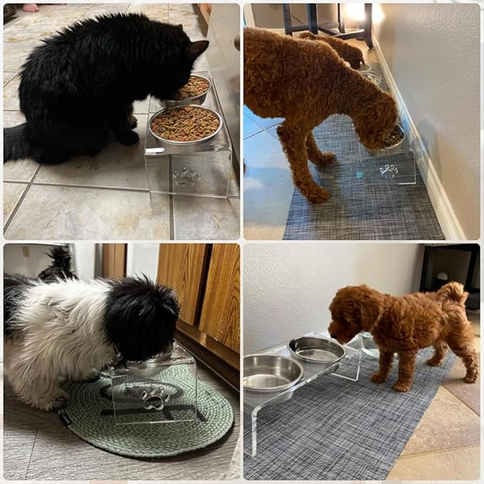 Raised Cat & Dog Bowl, Elevated Pet Feeding Station with 15 Tilted Neck Protective Acrylic Stand, Double Stainless Steel Bowls, for Small, Medium, Large Cats & Dogs