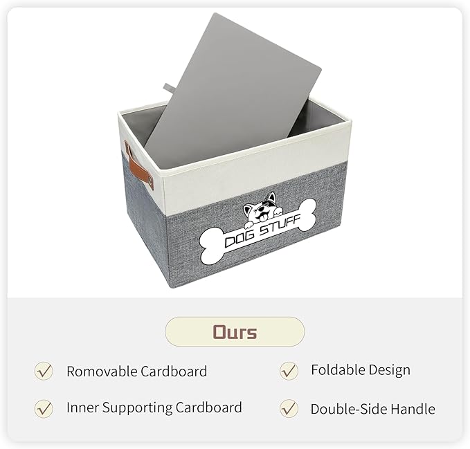 - Premium Quality: This dog toy bin is made of canvas with removable cardboard at the bottom, which is durable, dirt-resistant and sturdy for long time use. With fixed handles on the sides, this dog toy box can effortlessly move with a heavy load.