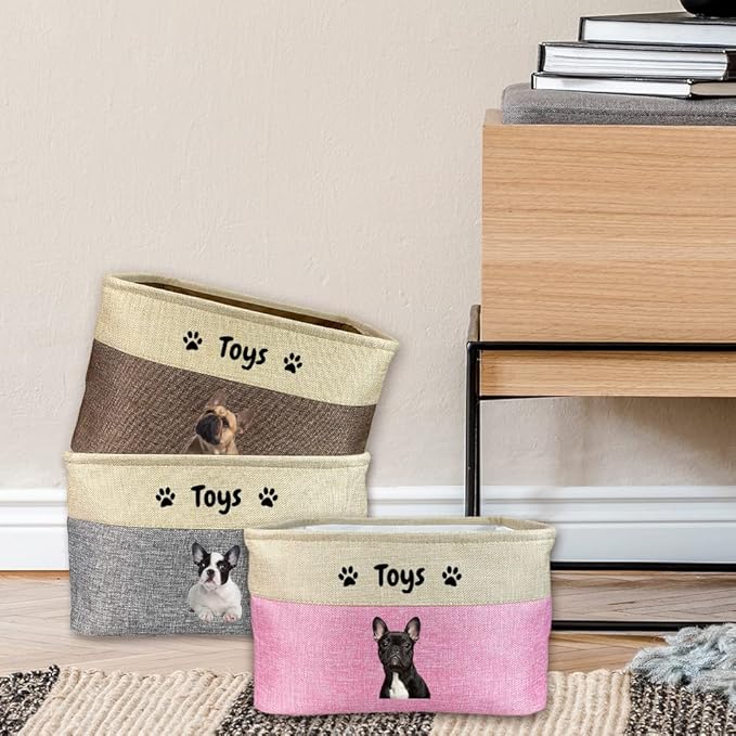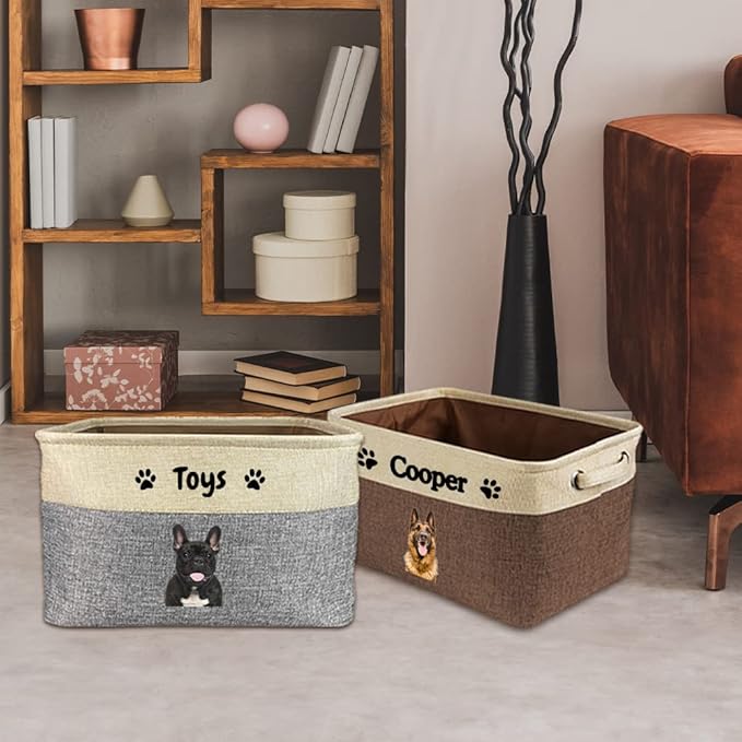 Custom Dog Basket for Toys Collapsible Storage Bin Grey Brow Pink Purple Blue Rectangular Pet Storage Organizer Box with Handles Medium Customized Name & Real Dog Breed