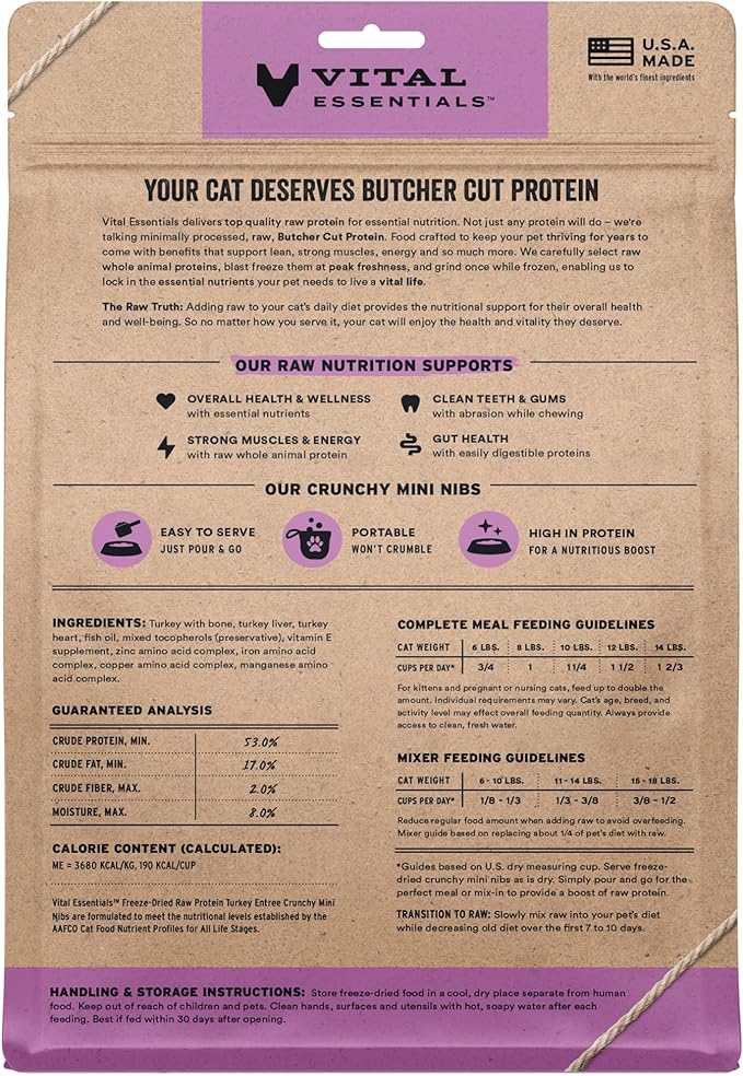 - CRUNCHY FREEZE-DRIED RAW TURKEY CAT FOOD: Vital Essentials Crunchy Freeze Dried Cat Food packs more protein than industry standard into every bite to deliver the peak vitality your cat deserves, especially when compared to dehydrated cat food. This complete and balanced freeze-dried raw cat food is made with premium butcher cut turkey, responsibly sourced in the USA.