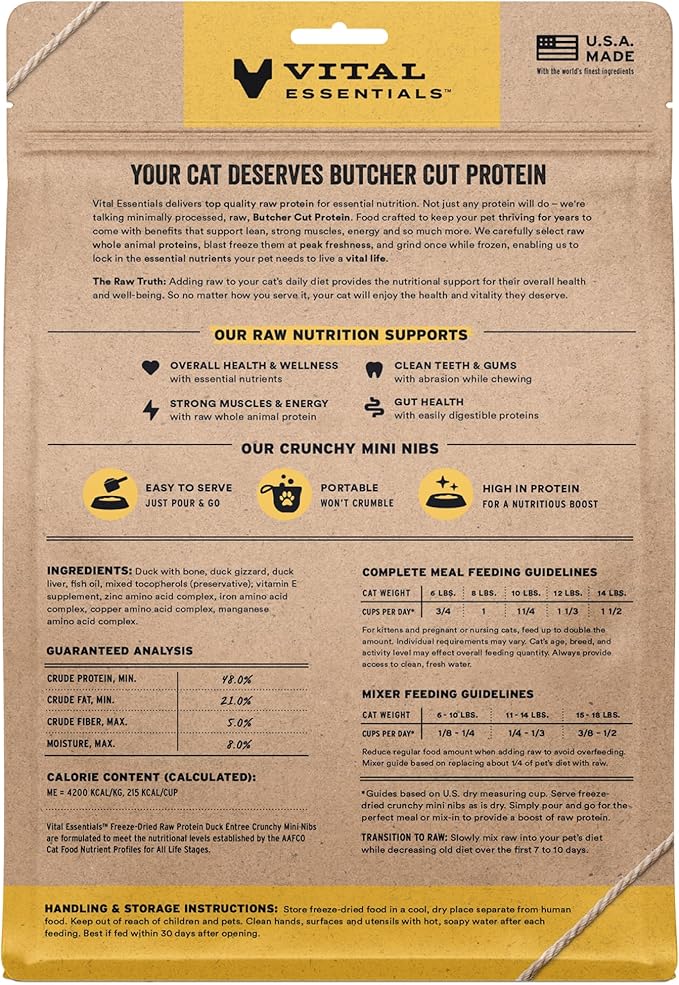 - CRUNCHY FREEZE-DRIED RAW DUCK CAT FOOD: Vital Essentials Crunchy Freeze Dried Cat Food packs more protein than industry standard into every bite to deliver the peak vitality your cat deserves, especially when compared to dehydrated cat food. This complete and balanced freeze-dried raw cat food is made with premium butcher cut duck, responsibly sourced in the EU.