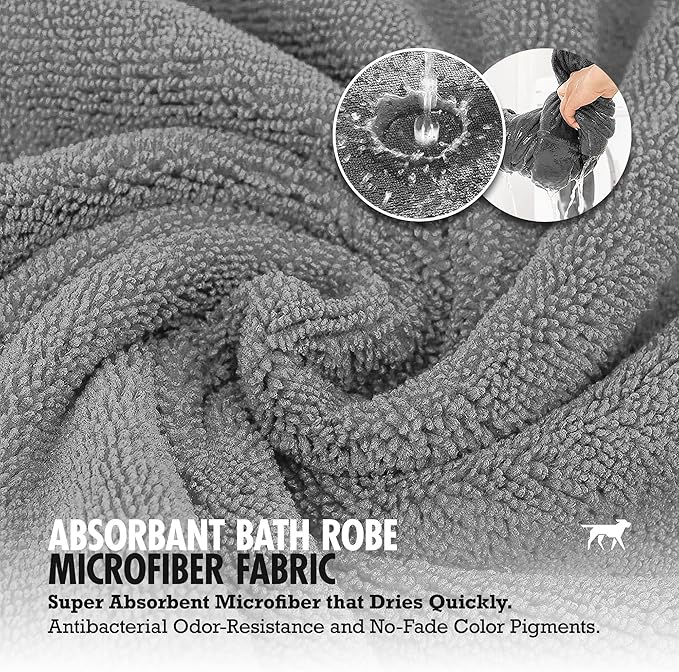 - SUPER ABSORBENT: Our microfiber dog drying coat has exceptional water-absorbing capabilities, holding over 5 times its weight in water. This makes drying your dog much faster and easier compared to other dog drying robes.