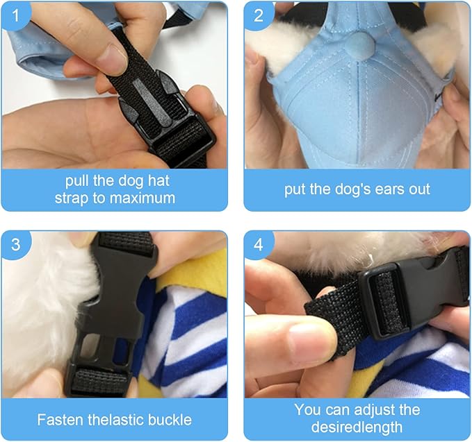 - 【EAR HOLES AND ADJUSTABLE STRAP】: The adorable pet outdoor sports hats own 2 ear holes, allow your pets to show their lovely ears. this dog visor cap has a quick release safe buckle for easy to use, the adjustable strap of the dog sun hat avoids falling out when protects your pet's eyes from strong sun rays. the baseball pet caps can use the chin strap to adjusted for different sizes of head shapes to prevent the hats being blown away by wind and falling during the pet's playing.