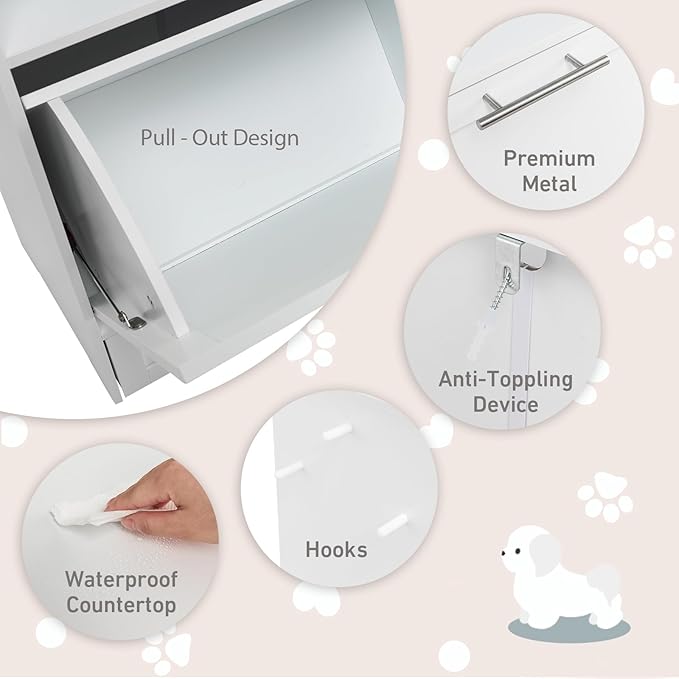 - đ±ăKeep Pet Supplies in One SpotăTransform clutter into something chic, this all-in-one pet cabinet includes a tilt-out dog food storage cabinet to keep your dogâs dry food; an open compartment to store can pet food; a wide countertop to put pet toys on; three side hangers to organize the leashes and grooming supplies.