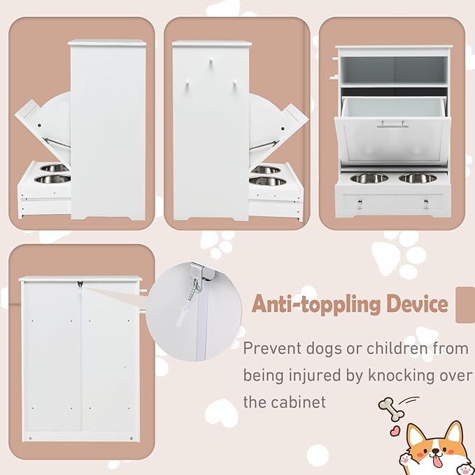 - đăSafe Stable, Low MaintenanceăHAPPAWS pet feeding station with anti-toppling device is more stable and safe, prevents your children and pets from getting hurt. Made of smooth MDF and Stainless Steel, this dog food cabinet feeding station is healthier and easy to keep clean.