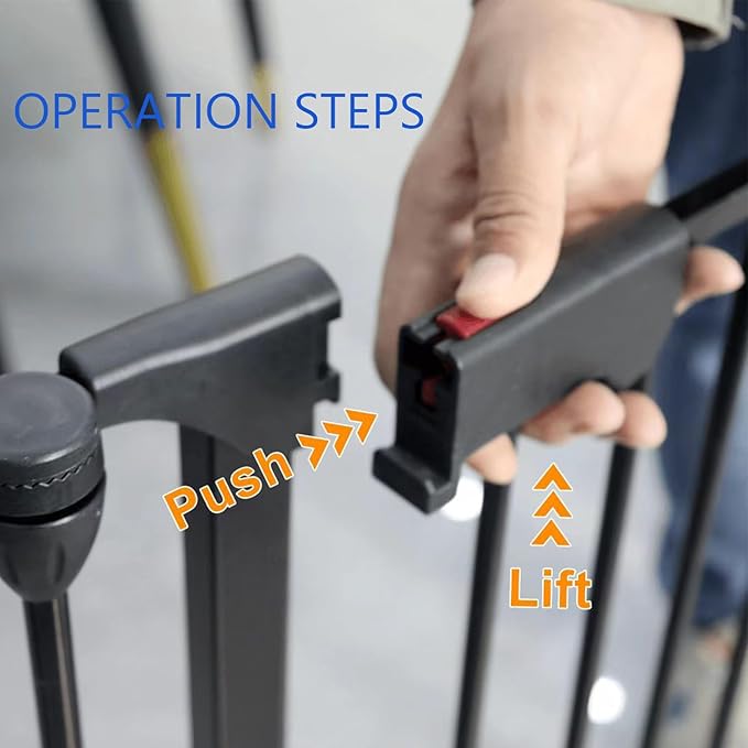 - 【Walk Through Door Gate】The entry door (19"W x 29"H) is built with a double-locking system and it is very easy to open even with one hand, press down the button and lift the gate at the same time to open. The gate swing in both ways