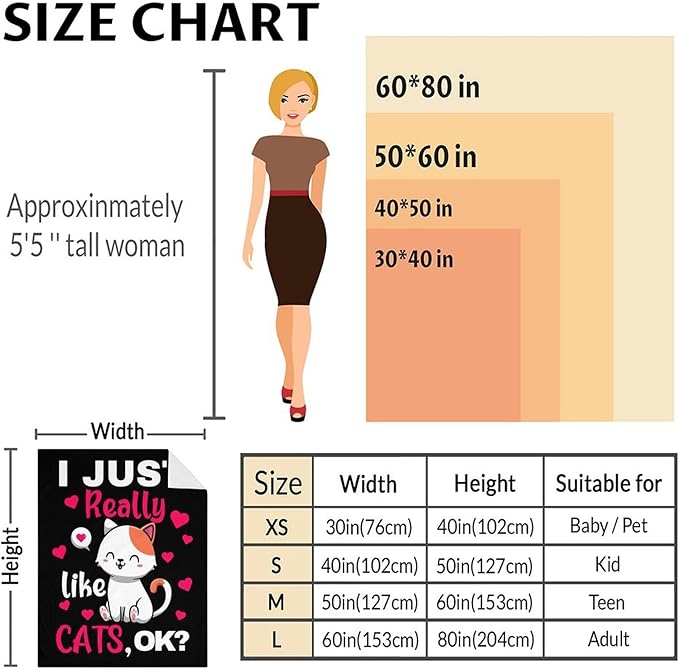 - Versatile Sizes for Every Need: Our Cat-themed fleece blankets come in a range of sizes to cater to your specific requirements. Whether you need a lap-size (30” x 40”) for cozying up on the couch, a crib-size (40” x 50”) for your little one, a throw-size (50” x 60”) for added warmth, or a twin-size (60” x 80”) for your bed, we have you covered. With these versatile size options, there's a perfect Cat blanket for everyone in the family.