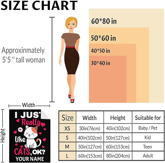 - Versatile Sizes for Every Need: Our Cat-themed fleece blankets come in a range of sizes to cater to your specific requirements. Whether you need a lap-size (30” x 40”) for cozying up on the couch, a crib-size (40” x 50”) for your little one, a throw-size (50” x 60”) for added warmth, or a twin-size (60” x 80”) for your bed, we have you covered. With these versatile size options, there's a perfect Cat blanket for everyone in the family.