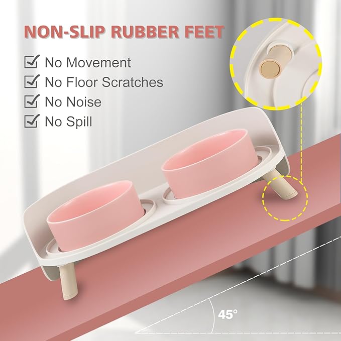 - No More Messy Floors - The raised cat bowl set with a splash proof guard that helps to prevent the spills or messes splashing out, saving your time on mopping and wiping. The bottom of each leg is equipped with non-slip rubber to prevent sliding when pets are eating and protect your floors.