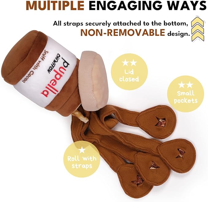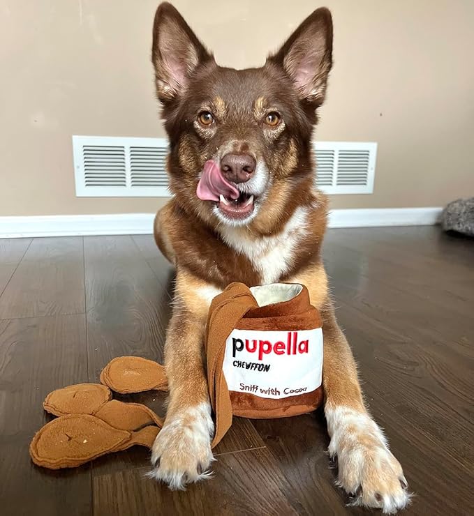 - Introducing the Pupella-shaped Dog Snuffle Toy - the perfect treat-hunting companion for your furry friend! Our innovative design features four treat pockets with a Pupella Jar, allowing you to hide delicious surprises for your dog to discover.