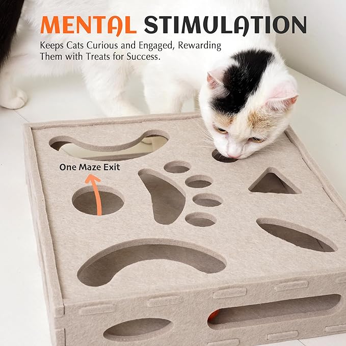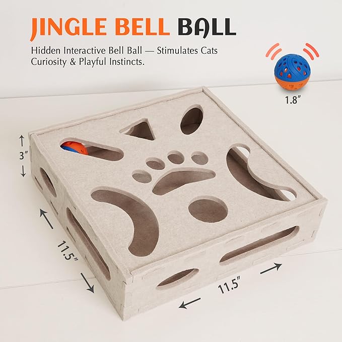 - ORIGINAL PUZZLE TOY: Features recyclable felt and hollow puzzle with jingle ball for indoor cats. The puzzle box stimulates kitty natural instincts, keep cat active and mentally engaged.