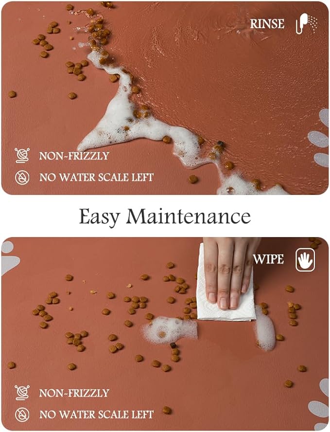 - Keep Clean & No Stains:No marks will be left when food and water are dropped on the dog food mat. Unlike traditional silicone pet feeding mats, our pet feeding mat for food and water won't pick up pet hair or dust, and won't build up tough-to-clean limescale, keeping the dog bowl mat as good as new forever.