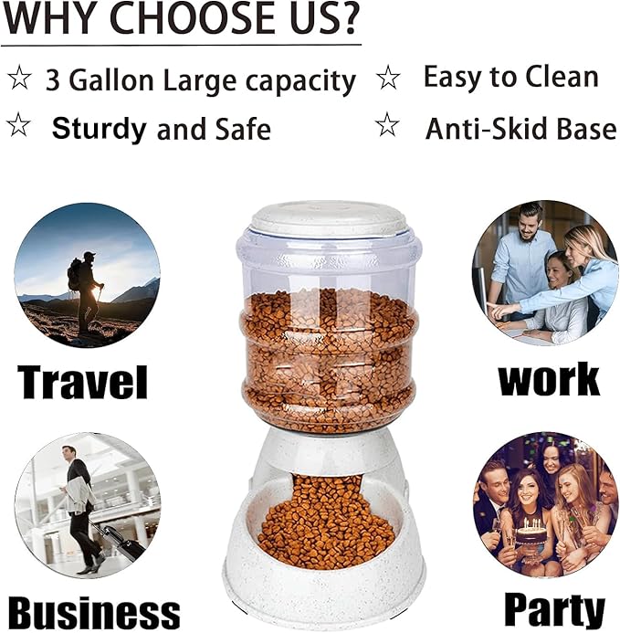 - 【Large Capacity Food Dispenser】:The Dog feeder has 3 gallon capacity and a single filling is enough food for large pets for 6-15 days,small pets for 20-45 days. Better suited to large pets and long term travellers.