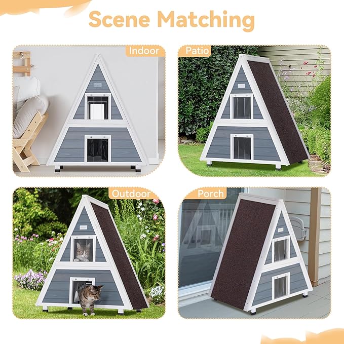 - Unique Triangular Design: This outside cat house(31" L x 20" W x 36" H) features a distinctive triangular shape, adding a touch of style to your backyard or patio. The unique design stands out and provides a cozy shelter for your feline friend.