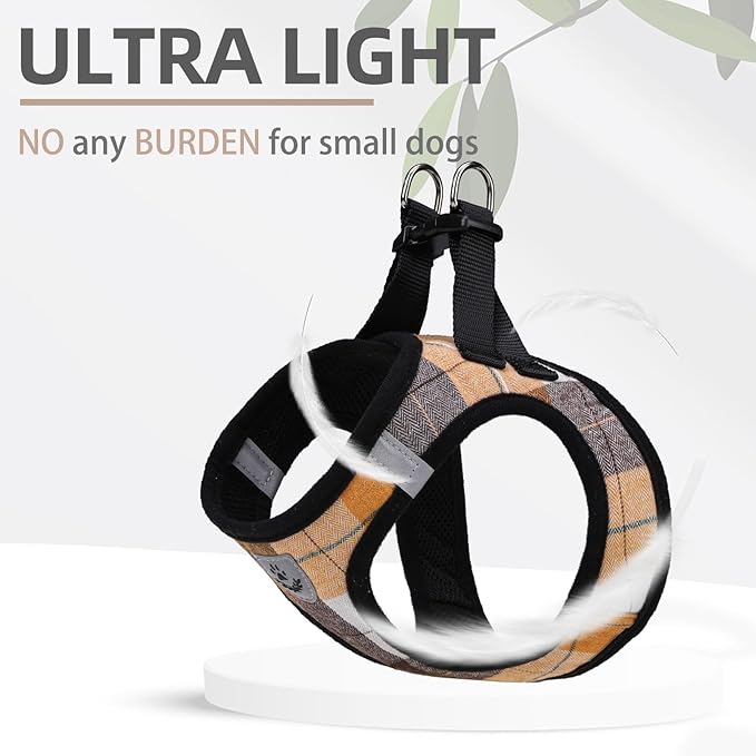 - [REFLECTIVE, PLAID PATTERN] - This Harness has two sides of reflective straps, and the middle logo also is reflective, so if you walk with your dog at night, then both of you will be safer! In addition, the classic plaid pattern is designed by our internal brand team, so it's very different from other normal harnesses. This plaid pattern looks both classic and stylish and is never out of date.