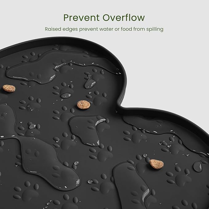 - Raised Edge - The high edge of this feeder mat keeps food and water within the tray and prevents spillage onto a clean floor. Keep your living space tidy and clean, say goodbye to messy floors, you just need to clean the dog bowl mat regularly.