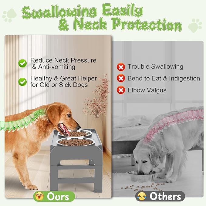 - 🐕Adjustable Height for Medium & Large Sized Dogs: Responsible for your furr friend's diet from puppy to senior! Our elevated dog bowls are adjustable for 4 heights (12.36", 10.75", 9.2"and 3.7" ) can not only clearly less of a stretch for dog to reach the food and water, but also easy for us to reach the dog bowls when it comes to leaning over.