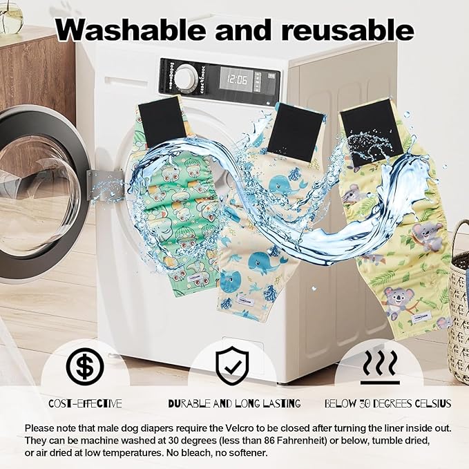 - Durable and Frugal: The boy dog diaper wraps are designed for durability with precision stitching to withstand daily use and frequent washing. Doggie diapers for males are machine washable at 30 degrees Less than 86 Fahrenheit) or below, tumble dry, or air dry at low temperatures. No bleach, no softener.