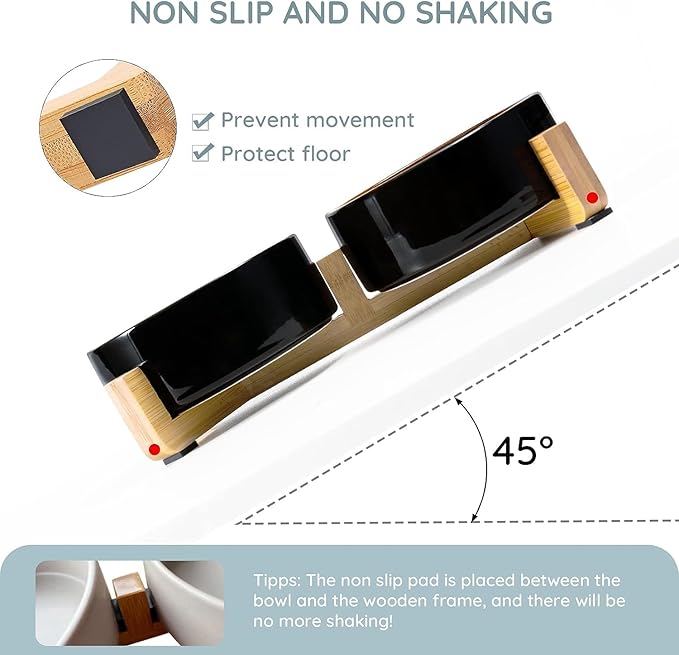 - [Double Bowl Design]:One dog bowl for food and one for water, Each ceramic cat bowl has a Unique wooden stand, raising the dishes closer to your pet for more comfortable eating