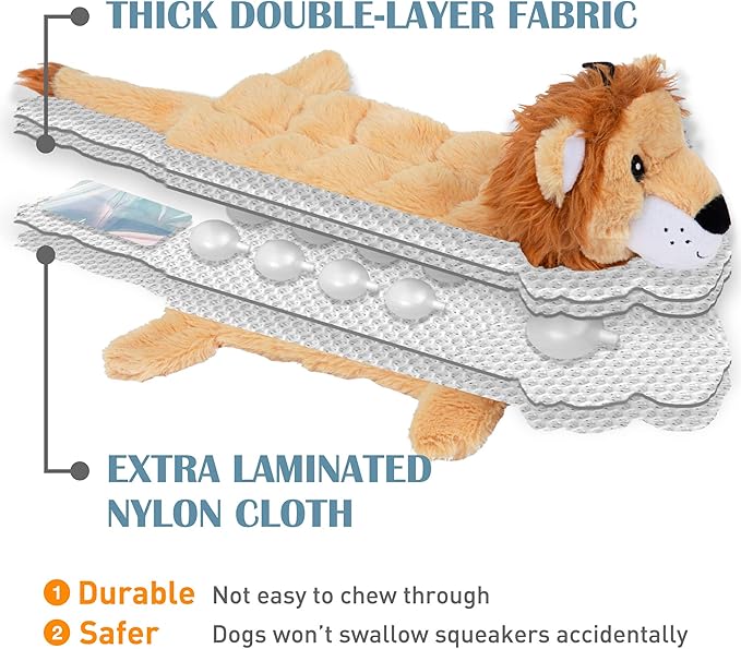 - SAFE AND LONGER LASTING For added strength, extra nylon webbing is sewn beneath the surface and even the squeakers are sewn into individual pouches for added protection. Electricity embroidery technology and high quality fabrics ensure strong and bite-resistant stitch lines. Completely safe to put in the washing machine for a hassle-free clean. And no stuffing body has no hidden danger for your dog to chew, swallow, or choke on.