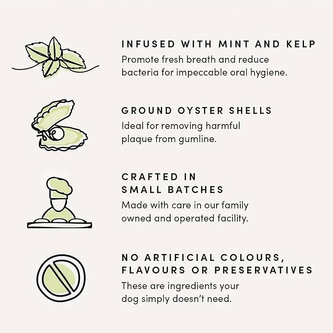 - NEW! With Sea Kelp and Mint to support fresh breath and oral hygiene our advanced dental sticks are a great way to make oral care fun for your dog!
