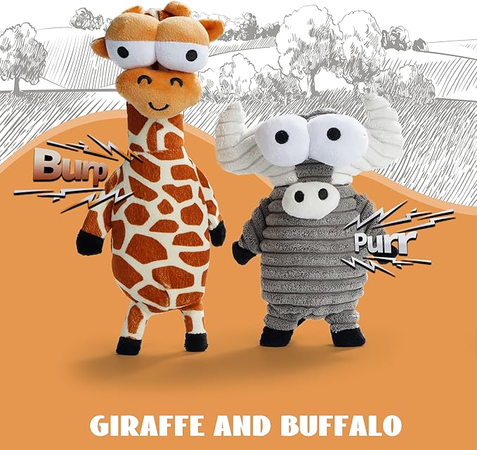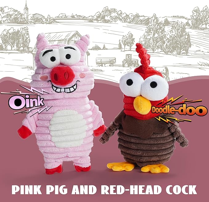 - Dog’s Critter Zoo: This set includes five charming dog toys - Red-head Chicken, Pink Pig, Giraffe, Buffalo, and Mallard. Each toy is thoughtfully designed with a unique built-in squeaker, ensuring a variety of engaging sounds for your playful pup