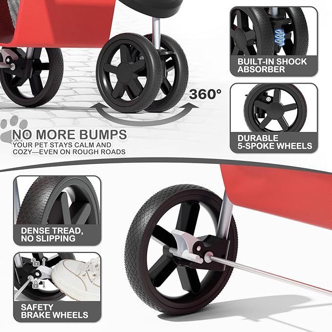 - Flexible Wheels - Finally, the 360° swiveling front wheel with a shock absorber ensures that your pet has a smooth ride even on the roughest terrain. The rear two wheels also feature brakes, making this stroller a perfect fit for injured or senior dogs or puppies that need a little extra TLC.