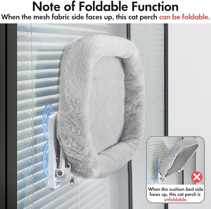 - Note of Foldable Function: This cat window perch is unfoldable when the cushion bed side of the cover facing up, and it is foldable when the mesh fabric side facing up. If you want to fold it up to close your blind, you could flip the cover so that the mesh fabric side facing up, and then fold it up. In this way, you can freely close or open your blind without interference.