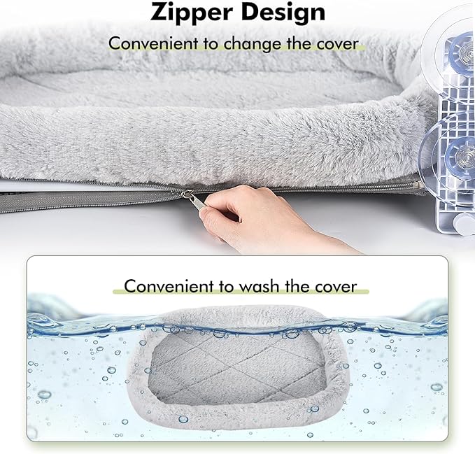 - Comfortable Cushion Bed Cover:This cat window perch is upgraded with thickened fluffy cushion bed cover, which give cats more comfort and safety while sleeping on it. The reverse side is breathable sandwich mesh. You can change the cover at any time by the zipper. Both of them are bite and scratch resistant, with no chemical smell. The cloth cover is also removable for wash.