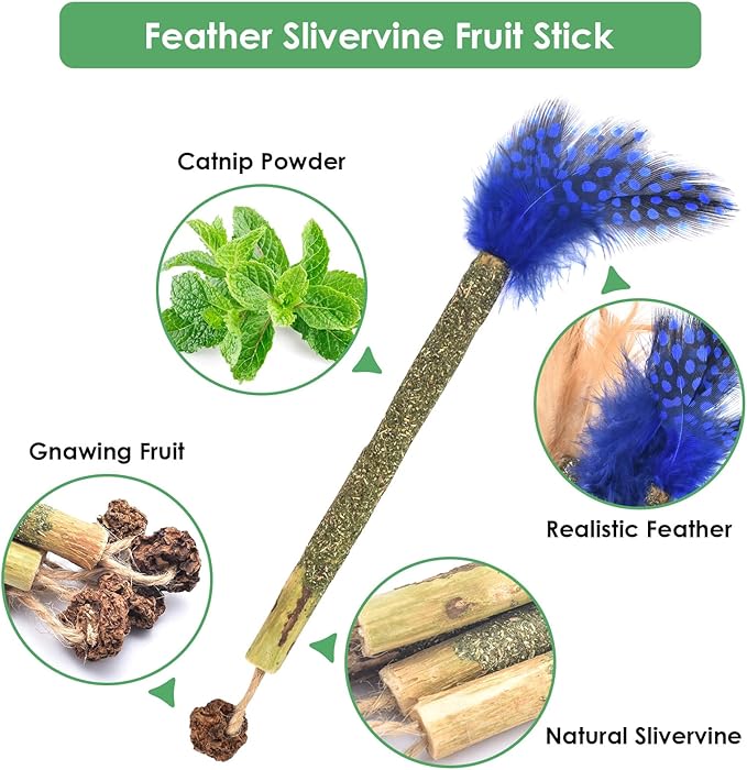 - 100% Natural Cat Chew Toy: 12pcs silvervine sticks for cats are made from FSC-Certified wood natural silvervine ( also called Matatabi) plant material, Lafite flowers, feather and polyline filling fruit gnawing fruit, catnip and hemp rope, which are safe and healthy, no additives or preservatives