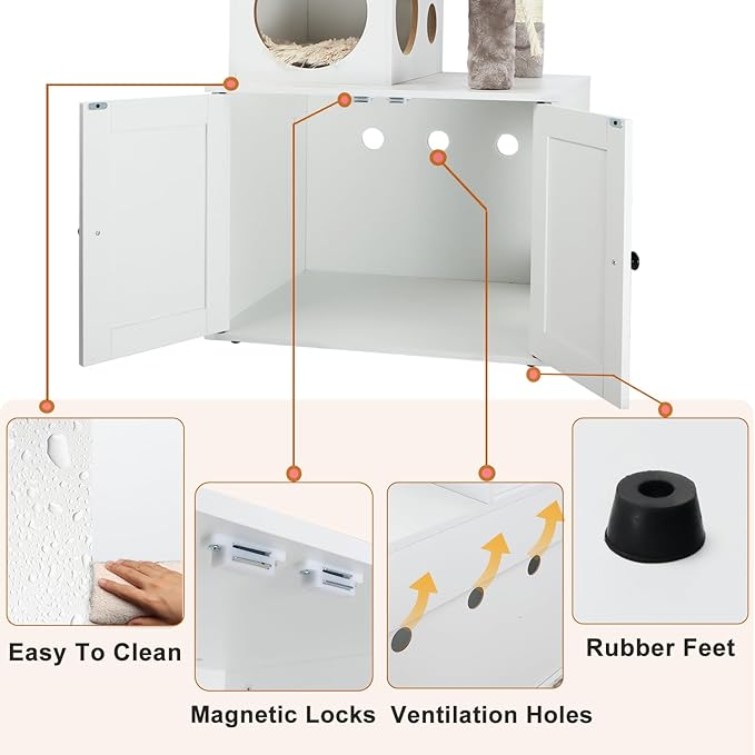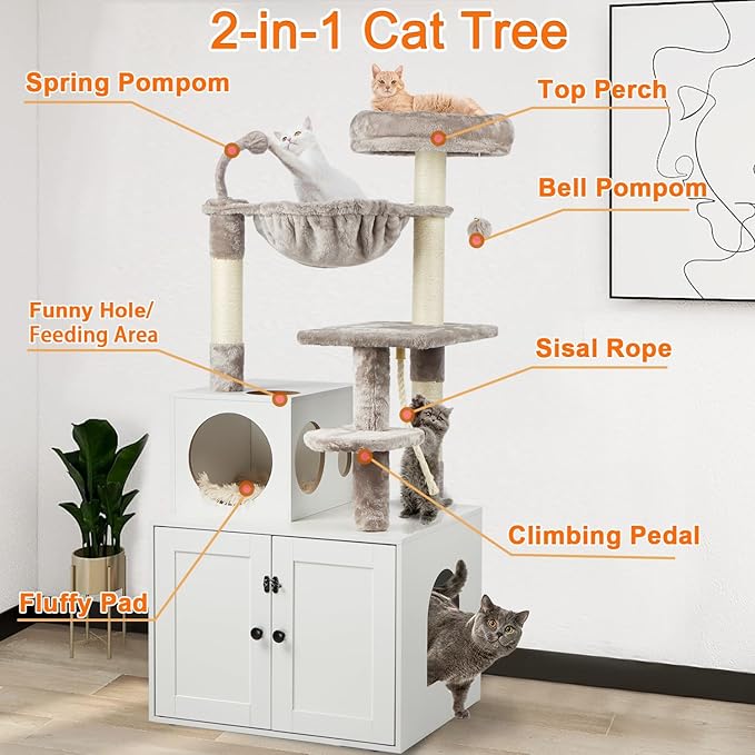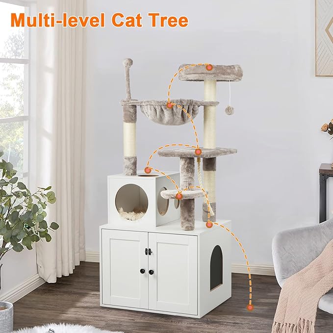 - Multifunctional Cat Tree - This cat tree with litter box enclosure fits anywhere in your room. Not only practical but will also be an ornament. With simple and clear instructions and part numbers, allowing you to overcome the fear of assembly