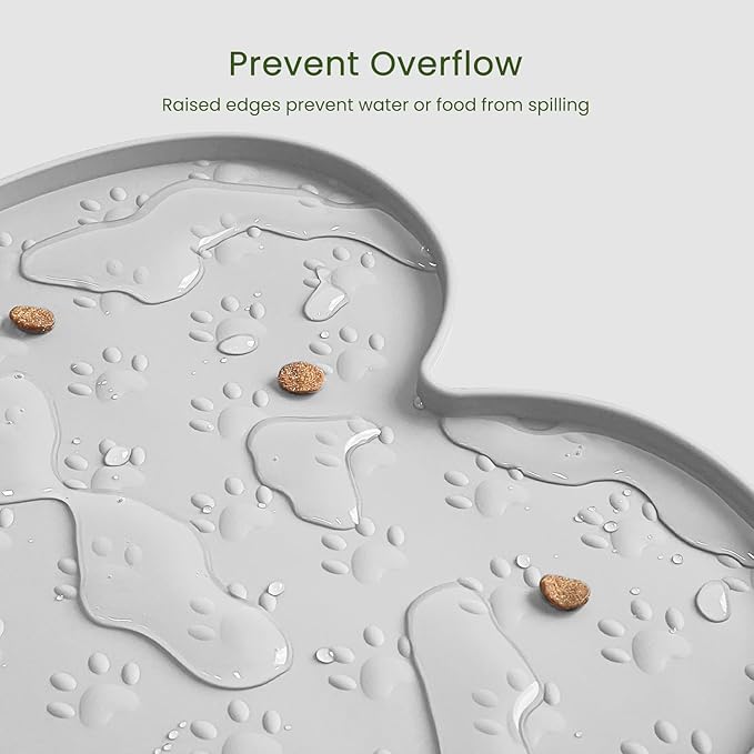 - Raised Edge - The high edge of this feeder mat keeps food and water within the tray and prevents spillage onto a clean floor. Keep your living space tidy and clean, say goodbye to messy floors, you just need to clean the dog bowl mat regularly.