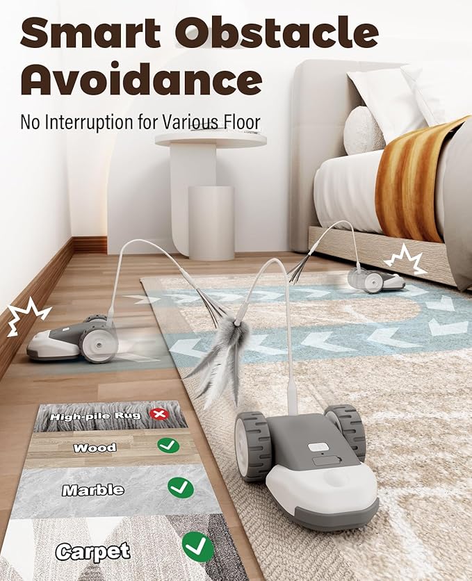 - 【Smart Obstacle Avoidance: No Interruption for Various Types of Floor】 Equipped with an obstacle avoidance timer, this automatic cat toy enables reverse, tumble or change direction every few seconds when crashing into the walls, sofa or other furniture without any break on various floors surfaces like wood, tile, marble and carpet. (Note: May not function well on high-pile rugs.)
