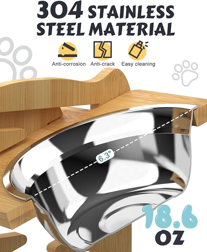 - Sturdy & Easy to Clean: Crafted from natural bamboo with a smooth finish, the elevated dog bowl is durable and odor-free. It comes with two stainless steel bowls, each with a 6-inch inner diameter, suitable for various types of pet food and water. The bowls are dishwasher safe for easy cleaning.It should be noted that our dog bowls stand cannot be in contact with water for a long time. Try to wipe off the remaining water on the surface of the dog bowl after cleaning.