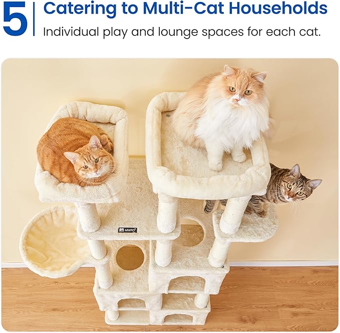 MWPO Large Cat Tree for Indoor Cats, 63-inch Cat Tower with 3 Cat Condos, Scratching Posts, Padded Perches, Hammock, Dangling Toys, Beige