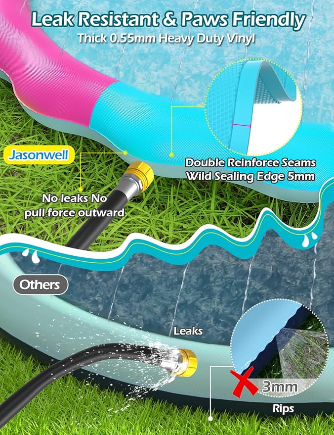 - 2024 Upgraded Sealing & Reinforced Seams to Prevent Leaks --- The splash sprinkler pad is double reinforced along the seams and with wide sealing edge to prevent any leaks along the stitching.