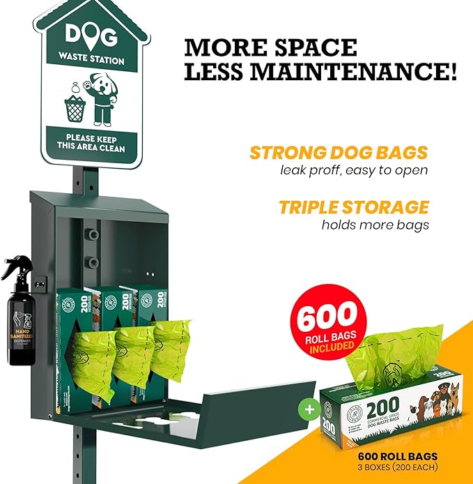 - ✅ Professional Dog Station Includes: Pet station ( doggie waste bag dispenser, bin garbage with lid and dog house shaped sign ) + 600 roll bags + 50 large can liner refill + free 75 pets poop bags with dispenser for leash. Everything included, get it now!