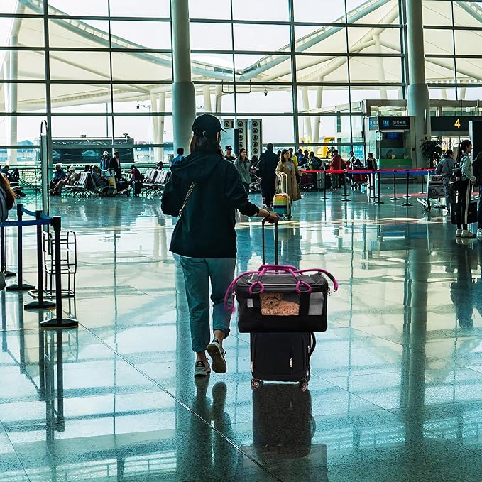 | TSA Airline Approved |Soft Sided Pet Carrier | Cat Carrier | Dog Carrier| Pets Up to 15 lbs | Leash & Luggage Strap | Black with Pink Handle