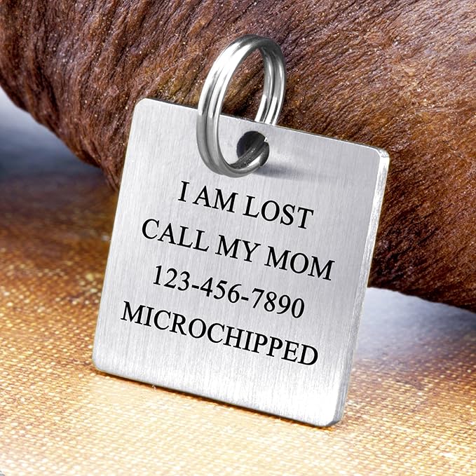 - Pet Id Tags For Cats: Handcrafted in Southern California, our cat and small pet ID tags are made of quality thick stainless steel, ensuring durability and resistance to rust. Each tag can be personalized with your pet's name and features an icon on the front. You can also add your contact information on the back for added safety and security, including phone number, address, or 'microchipped' status.
