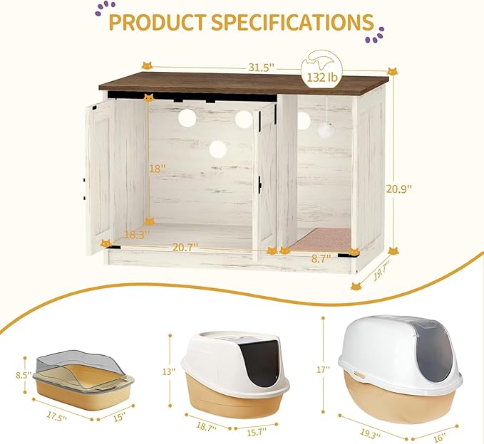 Cat Litter Box Enclosure, Hidden Litter Box Cabinet Furniture with Bell, Indoor Cats House, Farmhouse Style, 31.5 x 19.7 x 20.9Inches, for Hallway, Bedroom, Rustic Brown and White CB82414X